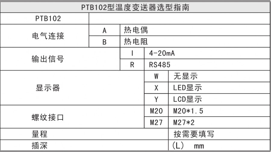 PTB102采用進口溫度敏感元件,經(jīng)過專用集成電路處理,輸出4-20mA電流信號及RS485數(shù)字信號。產(chǎn)品具有精度高、穩(wěn)定性好、壽命長、可靠性高、安裝方便等特點。適用于石油、化工等行業(yè)進行流體溫度的測量。