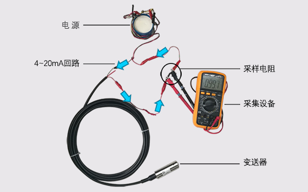 下圖為實(shí)際應(yīng)用模擬圖,藍(lán)色箭頭所指為4~20mA電流流向,使用萬用表作為采集設(shè)備,采樣電阻250歐,零點(diǎn)電流4mA,采集到的電壓約0.997V(0.004mA×250歐=1V)。